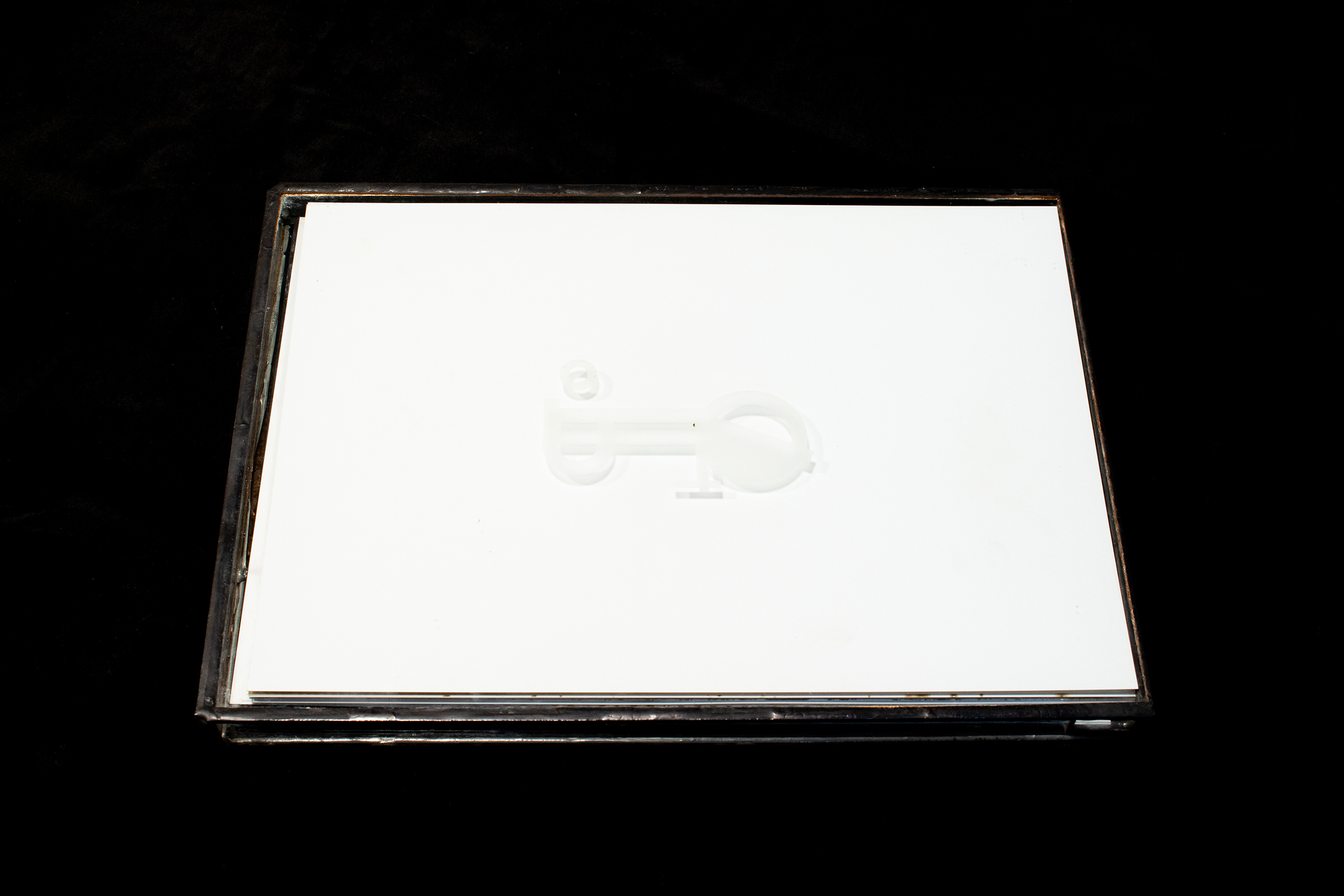 This book, titled as a (symbol), continues Reed’s experimentation with the material and presentation possibilities of the book form. Each volume comes in a handcrafted custom glass case with sliding glass drawer. The title and colophon are sandblasted into the surface of the case itself.